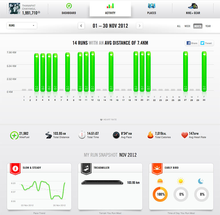 เริ่มเดือนใหม่ทันทีแต่ยังไม่หมดสัปดาห์ เสียดายที่เช้านี้น่าจะปิดด้วยสถิติสวยๆ สักหน่อยแต่เพราะตื่นนอนมากลางดึกเม่ือคืน หมดสภาพเลย ทั้งสัปดาห์วิ่งไปได้สามครั้ง สะสมระยะทางไปได้นิดหน่อยเท่านี้