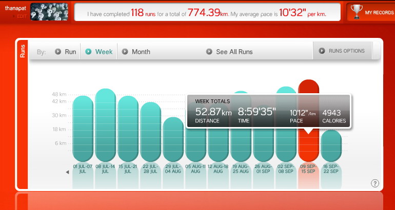 ถ้าไม่นับบุฟเฟต์อาหารญี่ปุ่นมื้อกลางวันเมื่อวันจันทร์ที่กินไม่ได้มากเสียเท่าไหร่เพราะอึ่มเร็วผิดปกติ ก็จะมีเหตุการณ์วันพุธที่ไปงีบหลับเสียตอนบ่ายแก่ๆ ทำให้คืนนั้นนอนไม่หลับ พาลทำให้ต้องลุกจากที่นอนมานั่งหยิบอะไรใส่ปากอยู่นาน ที่เป็นเหตุการณ์ไม่ปกติประจำสัปดาห์ เช้าขึ้นมาจึงไม่ได้เดินออกกำลังเพราะไม่พร้อมสักเท่าไหร่ ต่อมาวันศุกร์เช้าจึงตั้งใจว่าจะเดินชดเชย ปรากฏว่าฝนก็โรยลงมาอย่างไม่ผิดจากที่คาดนัก เดินไปได้ห้ากิโลก็ต้องหยุดเพราะพื้นที่ใต้หลังคาออกจะคับแคบ ไม่เหมาะสำหรับเดินนานๆ ตกเย็นเห็นโอกาสเหมาะจึงออกเดินอีกครั้ง ได้เต็มที่เพียงหกกิโลก็ไม่ไหวแล้ว