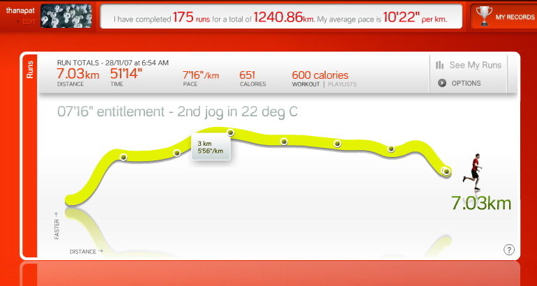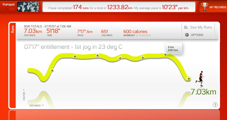 พอเช้าวันอังคาร อากาศเย็นเป็นใจเสียจริง จะเดินไปเรื่ิอย แม้จะสวมเสื้อกันหนาวไว้แล้ว แต่ก็ไม่รู้ว่าเหงื่อเม็ดแรกจะซึมออกมาเมื่อไหร่ เป็นไงเป็นกัน ออกวิ่งเหยาะๆ เสียเลย วิ่งไปสักครู่ก็ถอดเสื้อกันหนาวออกและตั้งใจมั่น อดทนจนวิ่งครบเป้าหมายที่ตั้งไว้ที่ “หกร้อย” แคลอรี่ ที่ตั้งไว้น้อยเพราะว่าตื่นสาย ออกกำลังกายสาย แต่อยากให้เสร็จราวๆ แปดโมงเช้าเหมือนเดิม จะได้ทำงานต่อ
