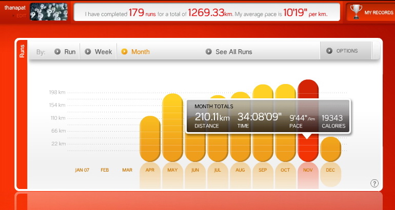 สัปดาห์ที่ผ่านมาแม้จะออกกำลังเพียงวันละไม่มาก แต่ต่อเนื่องทุกวัน ได้เหงื่อทุกวัน ก็รู้สึกดี และสถิติตลอดทั้งเดือนพฤศจิกายนก็ดีที่สุดเท่าที่ออกกำลังมา ระยะทางทะลุสองร้อยกิโลเมตรไปแล้ว