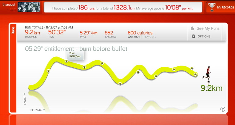 อาการบาดเจ็บที่หัวเข่าขวาเองก็รบกวนจิตใจไม่น้อย จะไม่วิ่งก็ไม่ได้ จะวิ่งก็กลัวว่าจะบาดเจ็บไปใหญ่ เท่าที่สังเกต หลังจากวิ่งไปได้สักสามกิโลกว่าทุกอย่างก็ดูเข้าที่ เหมือนระยะก่อนหน้าเป็นการอบอุ่นร่างกาย ทำให้ความรู้สึกอยากวิ่งต่อเมื่อถึงเป้าหมายที่หกร้อยแคลอรี่มีอยู่เรื่อยๆ นี่คือข้อดีของการตั้งเป้าไว้ต่ำ แต่ทำจริงให้ได้เกินกว่านั้น มีผลดีทางจิตวิทยาไม่น้อยเลย