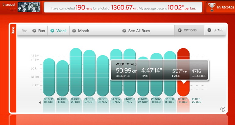 ยังดีที่สัปดาห์ที่ผ่านมายังสามารถรักษาการวิ่งเหยาะๆ ไว้ได้สม่ำเสมอดี มากบ้างน้อยบ้างไม่มีปัญหา สามารถปรับเปลี่ยนได้ตามสถานการณ์ ดีถึงขนาดที่สามารถทำระยะทางได้ถึงห้าสิบกิโลเมตรอีกครั้ง ขณะที่น้ำหนักตัวก็ยังวิ่งเล่นอยู่แถวๆ เก้าสิบกิโลอยู่เหมือนเดิม แม้ว่าเมื่อวันอังคารจะมีรายการพิเศษเป็นบุฟเฟต์อาหารญี่ปุ่นที่รอคอยมานานก็ตาม