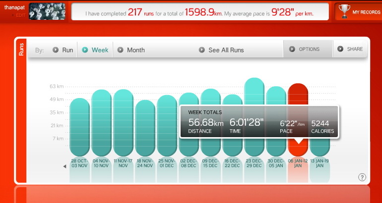 ตื่นนอนไม่ดีจึงทำให้วิ่งได้ราวเจ็ดกิโล แย่ที่สุดก็วันศุกร์ที่แทบจะอยากหยุดสักวัน แต่ก็บังคับตัวเองให้วิ่งได้ราวครึ่งชั่วโมง รวมๆ แล้ววิ่งได้เกินห้าสิบกิโลต่อสัปดาห์ไปนิดหน่อย ไม่สามารถทำให้ถึงหกสิบได้