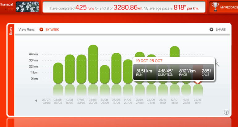 เริ่มวันแรกไม่บังคับตัวเองให้มากนัก วันต่อมาจึงพยายามให้มากขึ้นเพื่อสังเกตร่างกาย จนเช้าวันเสาร์วานนี้แทบจะหยุดวิ่งเสียตั้งแต่เนิ่นๆ แต่ก็ฝืนวิ่งต่อไปจนทำระยะทางได้ถึงเก้ากิโลอีกครั้ง ตั้งใจเตรียมร่างกายไว้สำหรับงานมินิมาราธอนในวันรุ่งชึ้น