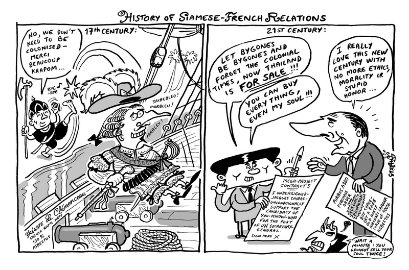 แต่เมื่อไม่นามมานี้ มีข่าวการเดินทางมาของผู้นำฝรั่งเศสสมัยนี้ เป็นการเยือนประเทศไทยในแบบที่ไม่เคยมีมาก่อน การพบกันของผู้บริหารประเทศทั้งสอง กอรปกับความรู้สึกเปรียบเทียบอันเนื่องมาจากฐานความรู้ที่ผมได้ศึกษามานั้น ทำให้เกิดความคิดขึ้นมาเองว่าสมัยก่อนเราต้องอดทนต่อสู้อย่างหนักเพื่อรักษาเอกราชจากการรุกรานของฝรั่งเศส แต่สมัยนี้ดันกับตาลปัตรตรงที่ผู้บริหารประเทศตั้งหน้าตั้งตาจะยกเอกราชไปให้เขา ไม่ว่าจะมีเหตุปัจจัยอะไรผลักดัน ไม่ว่าจะมีเหตุผลมากมายเป็นน้ำท่วมทุ่ง มันก็ไม่สามารถลบล้างความรู้สึกว่าเรากำลังถูกคนบางคนขายชาติของเราให้คนอื่นเพียงเพื่อประโยชน์ส่วนตัว เสียอย่างนั้น