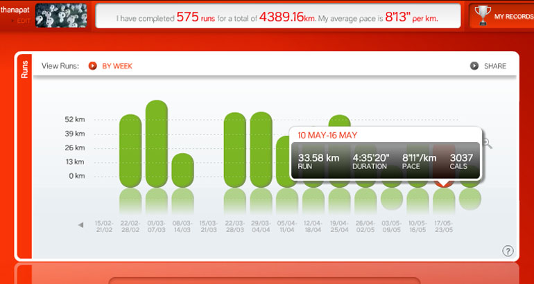บ่ายวันพฤหัสจึงต้องตัดสินใจหิ้วรองเท้าออกมาวิ่งในตอนบ่ายแก่ๆ หลังฝนจากไปตั้งแต่ช่วงสาย มาต่อได้อีกทีก็เช้าวันเสาร์ที่ไม่มีฝน แม้ปล่อยวางความรู้สึกว่าต้องเก็บระยะทางให้ได้มากๆ ไว้ก่อนแล้ว แต่ก็พยายามวิ่งให้ได้เก้ากิโลเพื่อชดเชยที่ไม่ได้วิ่งตามที่ควรจะเป็น