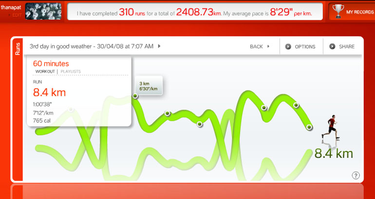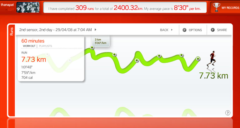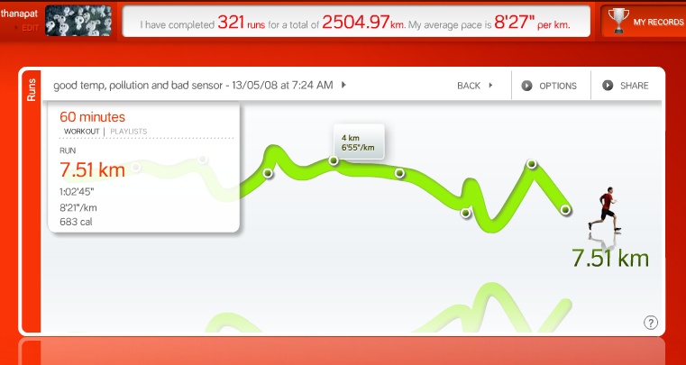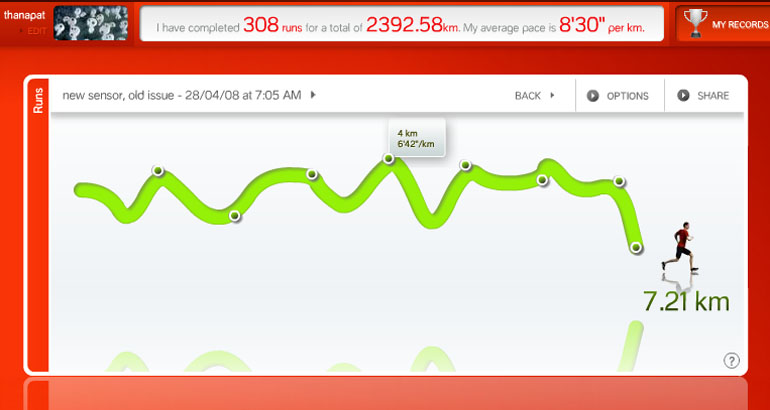 ผลการทดลองไม่แตกต่างจากอาการเอ๋อของเซนเซอร์ชุดเก่า ถึงแม้จะทำการรีเซ็ตไอพ็อดใหม่อีกครั้งก็ยังคงมีอาการไม่ต่างจากเดิม รู้สึกท้อใจไม่น้อย ลองอยู่สองสามรอบจึงตัดสินใจหยุด มานั่งอ่านข้อมูลจากผู้ใช้รายอื่น เขาก็พบปัญหาทำนองนี้ตั้งแต่เริ่มใช้งานใหม่ๆ เหมือนกัน ไม่ได้เป็นที่เราคนเดียว จึงพยายามทำใจ บอกตัวเองว่าอย่าไปยึดติดกับสถิติตัวเลขให้มากนัก ปัญหาสำคัญอยู่ที่วิ่งไปแล้วบนหน้าจอกลับไม่รายงานความเร็วในขณะนั้นออกมา บ้างก็รายงานเพี้ยนไปเป็นช้ากว่าที่ควรถึงสองเท่าตัว คงจะแก้ไขอะไรไม่ได้มากนักในตอนนี้ ตั้งใจใหม่ว่าอย่างไรก็วิ่งให้ได้หกสิบนาทีต่อวันก็แล้วกัน จะได้ระยะทางเท่าไหร่ก็เท่านั้น