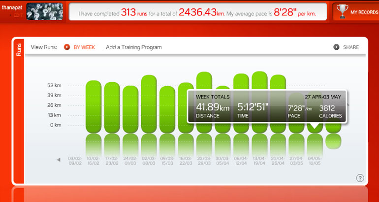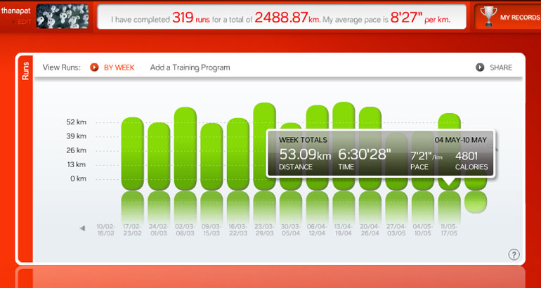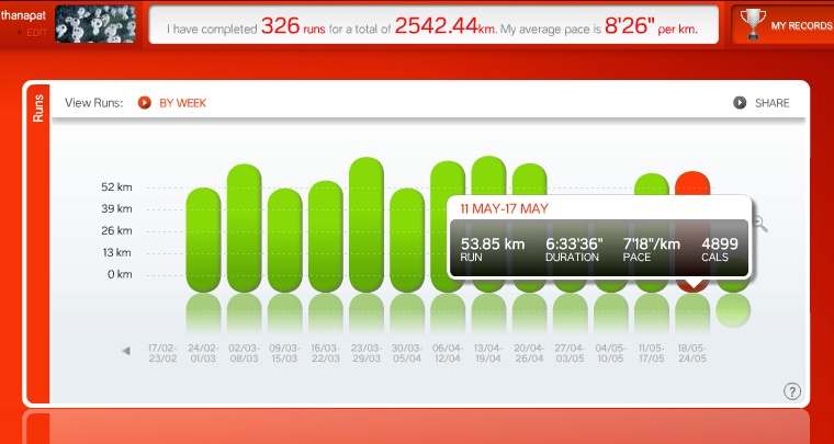 รุ่งขึ้นก็สามารถกลับมาออกกำลังได้อีก จนเช้าวันเสาร์ก็มีเรื่องให้แปลกใจเข้าไปใหญ่เมื่อสามารถทำระยะทางได้เกินเก้ากิโลเมตรในหกสิบนาที จึงวิ่งต่อไปเพื่อให้ได้สิบกิโลเสียเลย เพราะอากาศค่อนข้างเย็นจากคืนฝนพรำเป็นใจให้อยู่แล้ว สถิติของสัปดาห์นี้ยังคงไล่เรี่ยกับสัปดาห์ก่อน