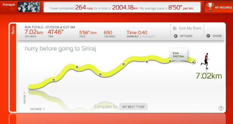 ไม่รู้ว่าเพราะอะไรการตื่นนอนแต่ละเช้านช่างหนักหนาสาหัสยิ่งนัก จะเช้าจะสายขนาดไหนก็พยายามวิ่งออกกำลังกายให้ได้ห้าสิบนาที แทนที่จะกำหนดเป้าหมายไว้ที่แปดกิโลเมตรเพราะจะได้ไม่ต้องพวงกับเซ็นเซอร์ที่อาจจะเอ๋อบ้างจนทำให้ระยะทางแต่ละกิโลเมตรนั้นเนิ่นช้าจนเสียความรู้สึก ไหนๆ ก็ใช้เวลาเท่าๆ กันอยู่แล้ว ก็เลือกใช้เป้าหมายแบบช่วงเวลาไว้ เพื่อให้มีเสียงเตือนอย่างสม่ำเสมอทุกห้านาทีน่าดีกว่า