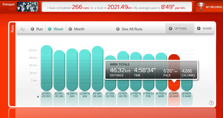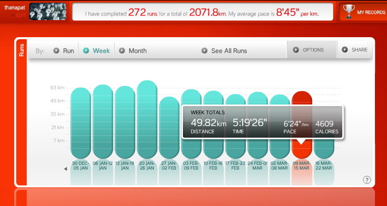 อากาศที่ร้อนขึ้นตั้งแต่เช้าก็ทำให้เหงื่อออกมาขึ้น แต่ไม่ถึงกับทำให้หมดแรงเพราะเสียน้ำ สถิติการออกกำลังประจำสัปดาห์จึงยังน่าดูอยู่เหมือนเดิม